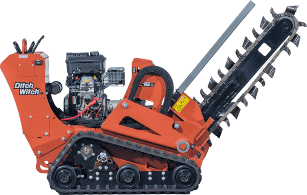 A compact, agile walk-behind trencher with a 16-horsepower Honda engine and tracks for better traction and maneuverability. It's designed for yards or job sites for laying pipes, electrical lines, and for agricultural applications.